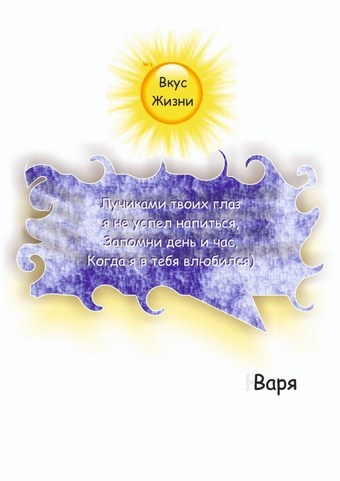 Книга «роман-осознание»В себеТебяПризнание,Призвание «домой!»Сборник – сплошная «эротика», —Диалог энергии души,Исцеление без антибиотиков,Пожар, что не желаемТушить.Путь босоногой эволюцииОт тебя и конечно к Тебе.Суть саморепродукции,Что любовь взрывает в себе.В каких бы ни встретились воплощениях,Напомним друг другу вновь:Любить можно только любовью,Любить можно только любовь